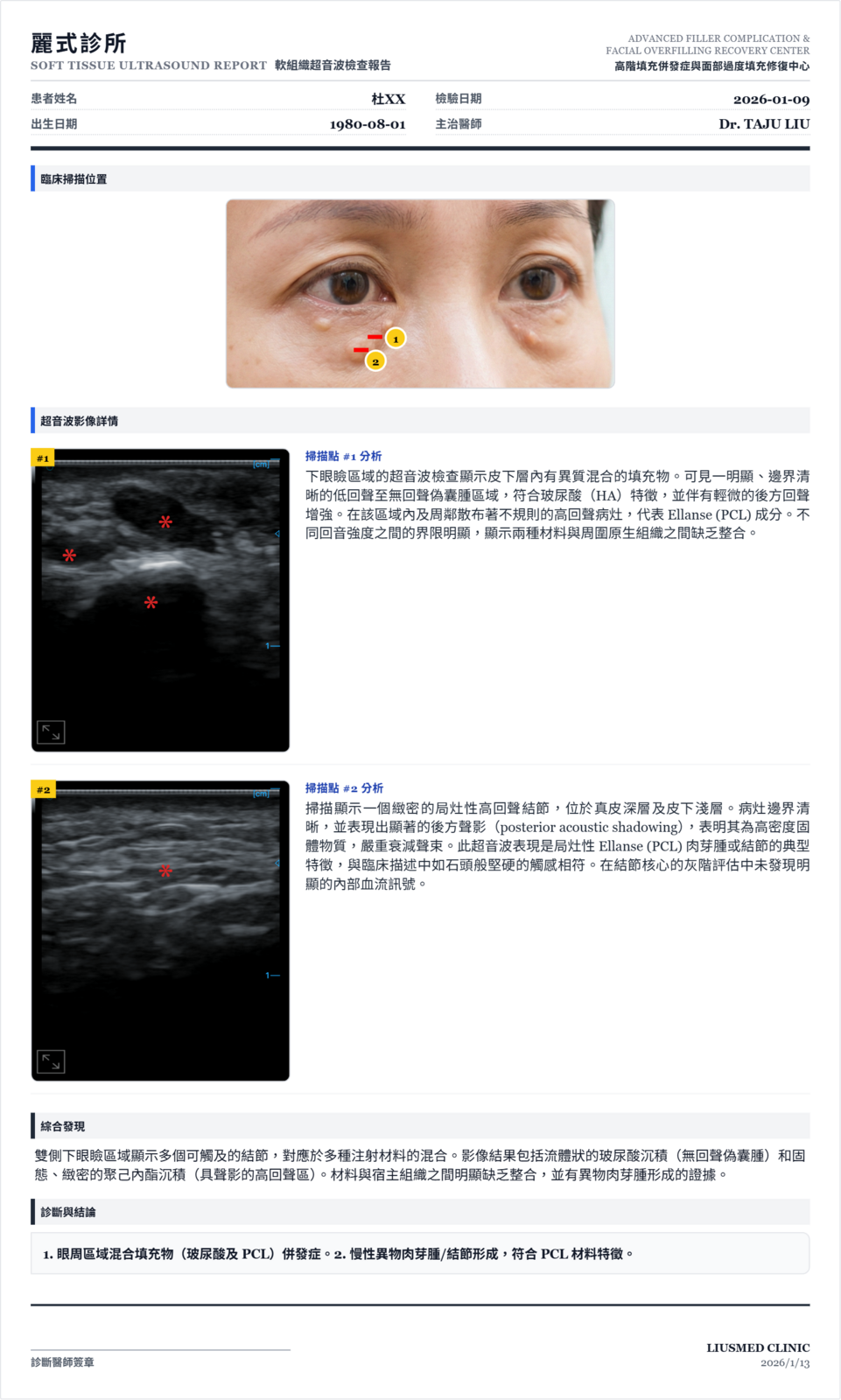 我一照超音波,答案其實很清楚。皮下整個結構已經亂掉了,尤其在掃描點 #2,那一顆又白又亮像石頭一樣硬的結節,是一種典型的肉芽腫反應。
